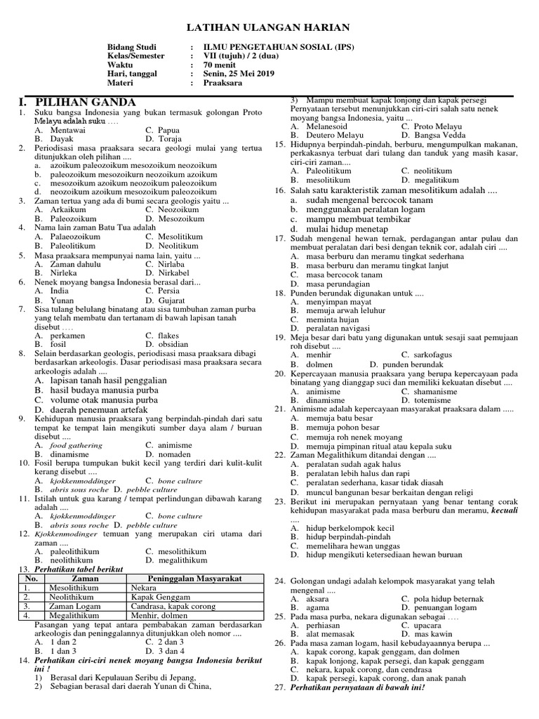 Soal Penilaian Harian Ips Kelas 7 Semester Genap Materi Masa Praaksara Mgmp Ips Indramayu